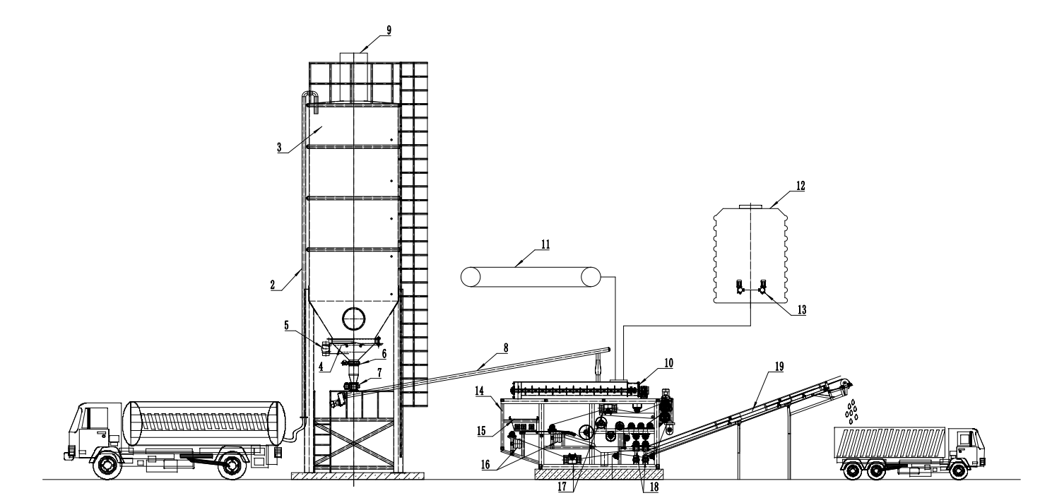 如圖1所示,本發(fā)明提供的一種污泥二次脫水設(shè)備,包括設(shè)置有3石灰料倉、8石灰傾斜螺旋、10污泥改性機、12污泥改性劑、14污泥二次脫水設(shè)備主機、19皮帶輸送機。